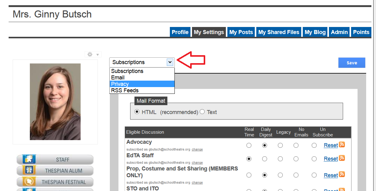 Daily Digest, one email daily that contains all of the previous day's activity. Next, click on the drop down menu and review your privacy settings: